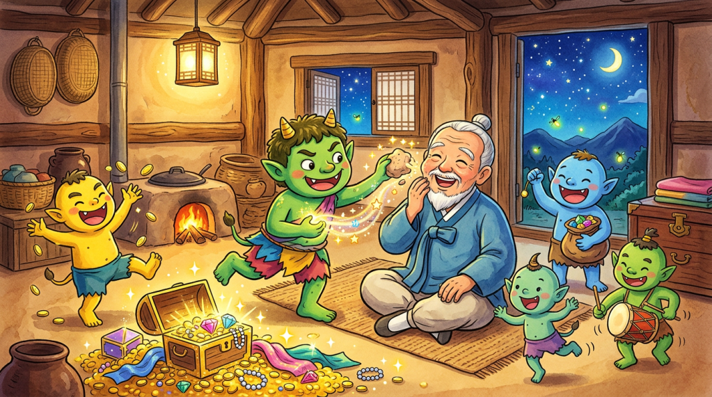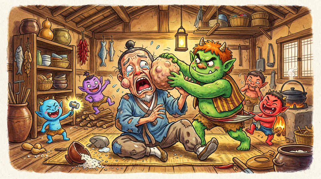 The story begins with an old man who has a large lump on his face. One day, he happens to encounter a group of dokkaebi, the playful and supernatural goblins of Korean folklore. Instead of panicking, he sings for them. The goblins are fascinated by his voice and ask where such wonderful music comes from. Thinking quickly, the old man jokingly says that the sound comes from the lump on his face. Believing him, the goblins remove the lump and even reward him with wealth. In a single strange night, the old man loses the burden he carried and gains unexpected fortune.