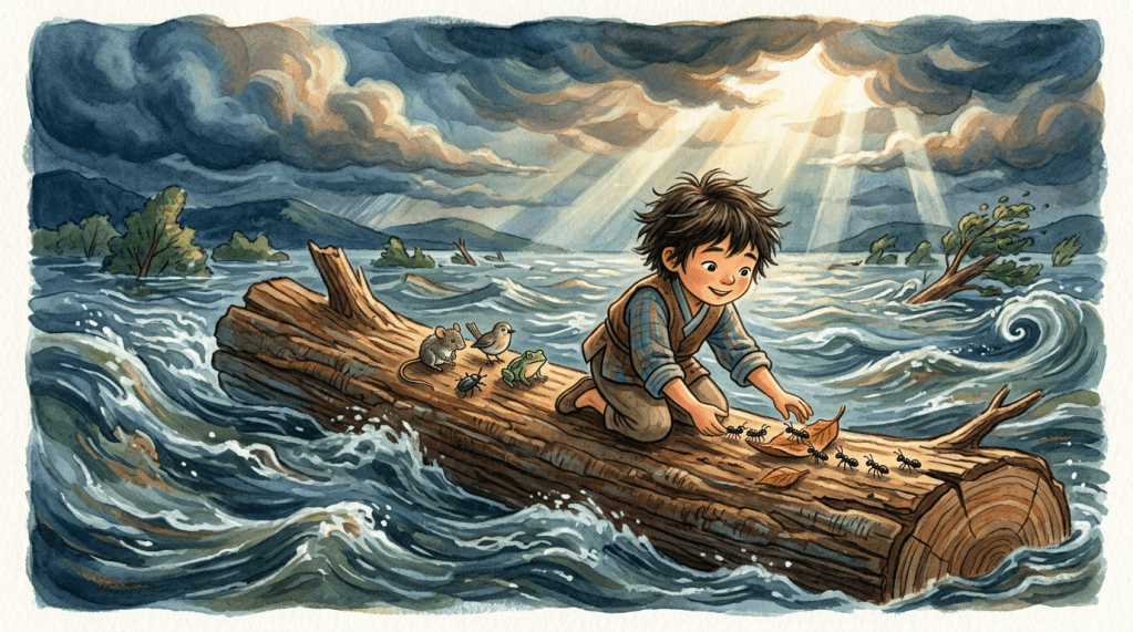 One day, a terrible flood covers the earth. As the waters rise, Namu Doryeong survives by riding on his father, the tree. While drifting through the flood, he encounters small living creatures begging to be saved. He kindly rescues ants and mosquitoes, showing compassion even in the middle of disaster. Later, he also saves a boy, even though the tree warns him against doing so. This moment becomes one of the most important turning points in the story, because it reveals the difference between instinctive kindness and the painful risk that sometimes comes with helping others.