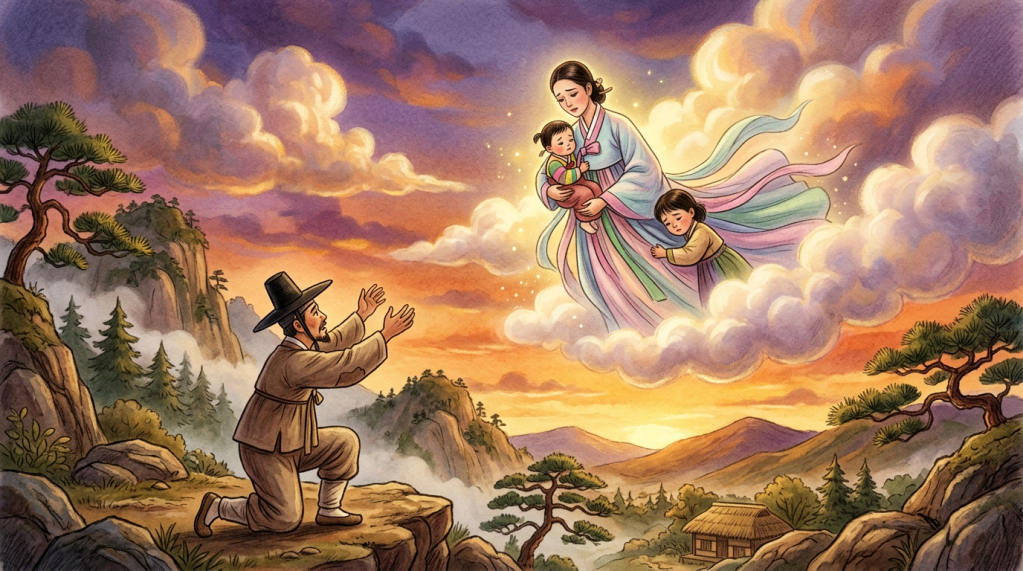 When the woodcutter returned and found his family gone, he was overcome with grief. He cried out to the mountains and searched everywhere, but the earth gave him no answer. Desperate, he prayed for a way to see his wife again. In some versions of the story, he later journeys to heaven and reunites with her for a time. In others, he is tested, fails, and loses her forever. In one of the most well-known Korean endings, he returns to earth because he misses his old mother, but he falls before he can safely come down and is transformed into a rooster, forever calling out in sorrow.
