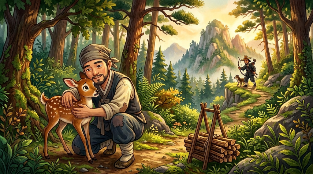 Long ago, deep in the mountains of Korea, there lived a poor woodcutter. He was kind and honest, but he was very lonely. Every day, he climbed the mountain to gather firewood, and every night, he returned to his small home with only silence waiting for him.