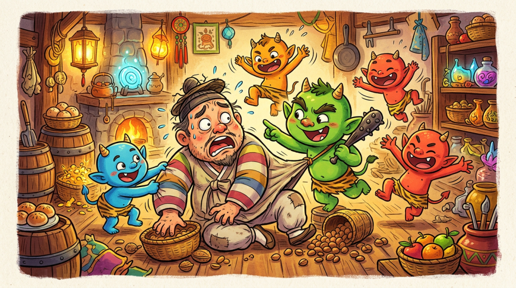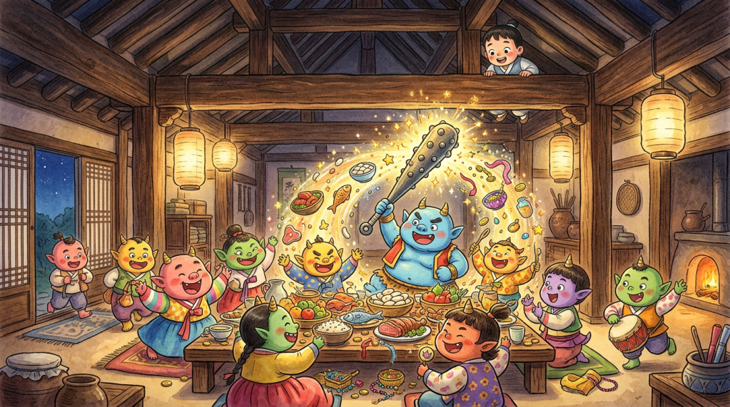 Among Korea’s many traditional folktales, The Goblin’s Club is one of the most lively and memorable. It is a story filled with humor, fantasy, and a clear moral lesson, making it especially popular as a children’s tale. At the heart of the story is a magical club owned by goblins—one that can produce treasure and all kinds of wonderful things. But as with many old folktales, the true power of the story lies not in the magic itself, but in what it reveals about human character.The story usually begins with a kind but poor younger brother, or sometimes a good-hearted man, who lives a hard life. One day, while gathering firewood in the mountains, he comes across hazelnuts rolling toward him one by one. His responses reveal his character immediately: he thinks first of his father, then his mother, and only afterward of himself. As night falls, he takes shelter in an empty house, not knowing that it is a place where goblins gather.