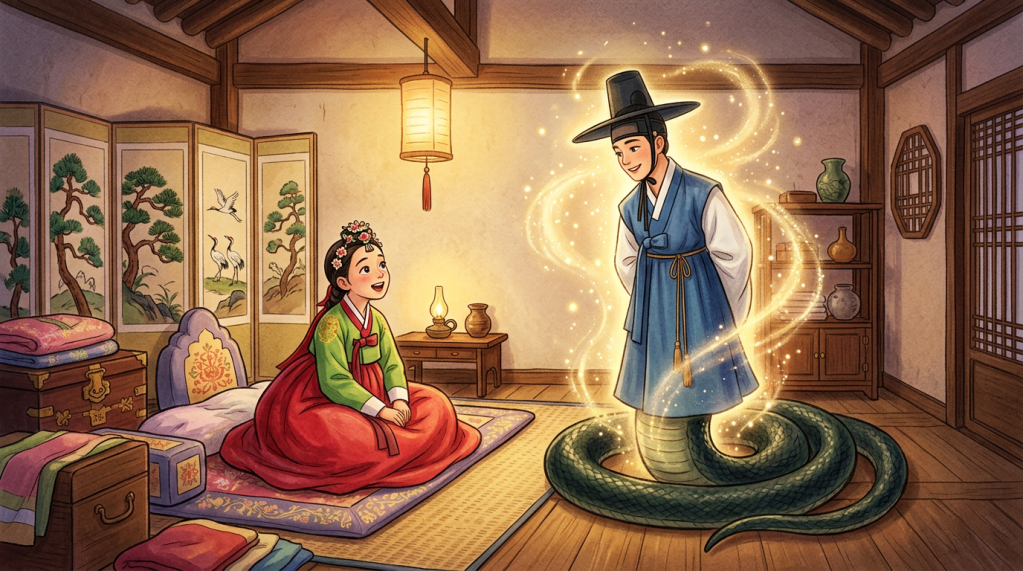 What makes this folktale especially striking is its layered meaning. On the surface, it is a magical tale about a serpent husband. At a deeper level, it is a story about trust, taboo, separation, and the determination to overcome suffering. The encyclopedia notes that the heroine’s journey and trials contain deep mythic symbolism, and that her suffering is connected to a broader pattern of women’s hardship in Korean narrative tradition.