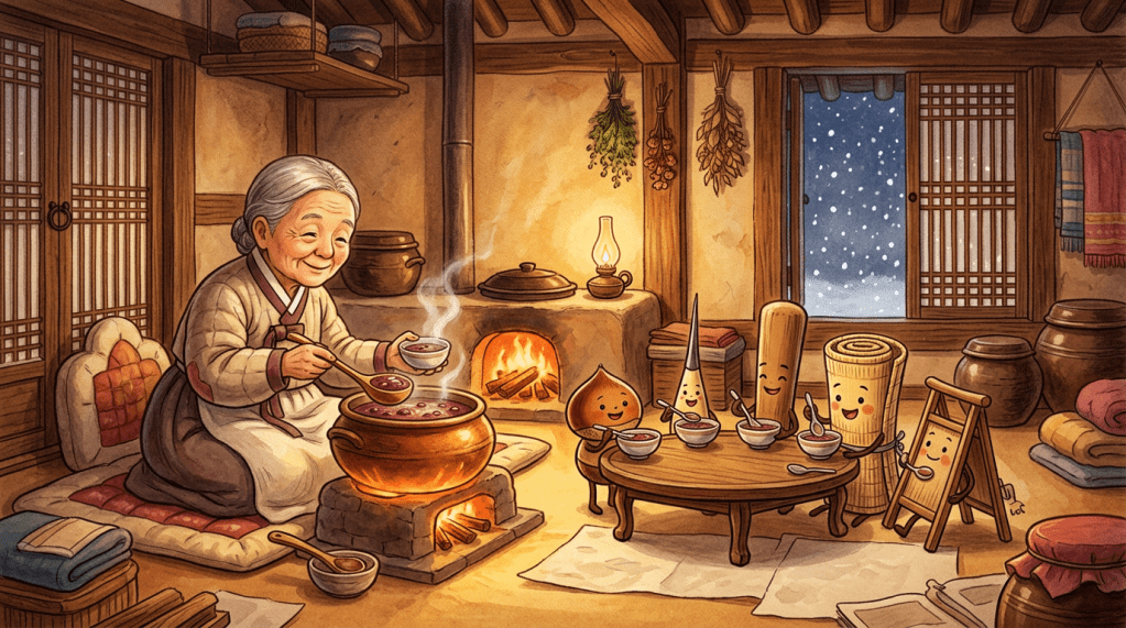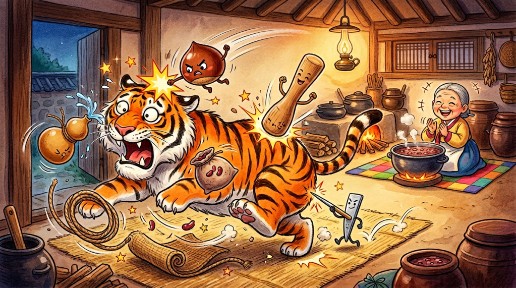 The story also carries cultural meaning through patjuk, or red bean porridge. In Korean tradition, red bean porridge is closely associated with Dongji, the winter solstice, and has long been believed to drive away misfortune or harmful spirits. Because of this association, the tiger in the story can be understood not only as a wild animal, but also as a symbol of danger or bad fortune that must be chased away. In that sense, the tale is not merely funny. It is connected to seasonal custom, protective ritual, and the hope that warmth and food can protect a household from fear.