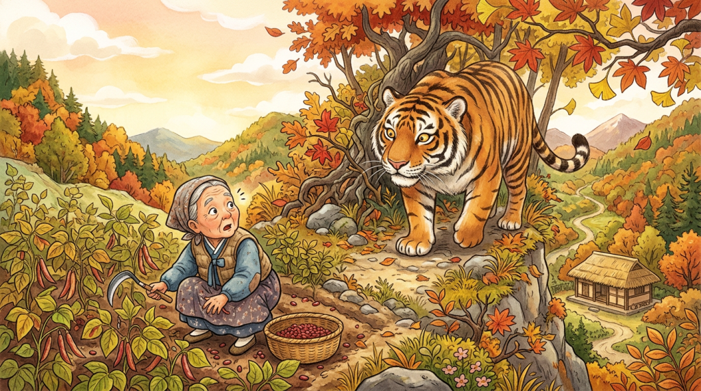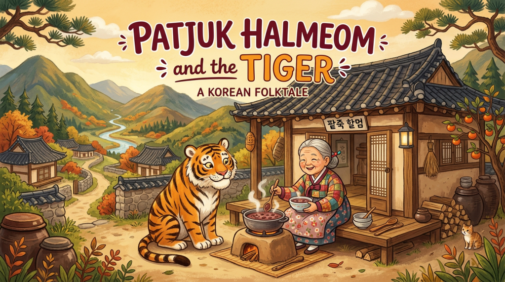 Among Korea’s traditional folktales, Patjuk Halmeom and the Tiger is one of the warmest and most entertaining. The title is often translated as “The Red Bean Porridge Granny and the Tiger.” At first, it sounds like a simple children’s story about an old woman and a hungry tiger. But beneath its playful tone, the tale carries themes of courage, mutual help, and the power of the small overcoming the strong. It also reflects Korea’s winter tradition of eating red bean porridge, especially on Dongji, the winter solstice.The story begins deep in the mountains, where an old woman lives alone and grows red beans in her field. One day, a huge tiger appears and threatens to eat her. Terrified but quick-thinking, the old woman pleads for more time. She tells the tiger to come back after she harvests her red beans and cooks him a proper bowl of red bean porridge. The tiger agrees and disappears into the mountain, certain that he will soon enjoy both the porridge and the old woman herself. This opening is simple, but it immediately establishes the contrast at the heart of the story: a weak old woman on one side, and a powerful predator on the other.